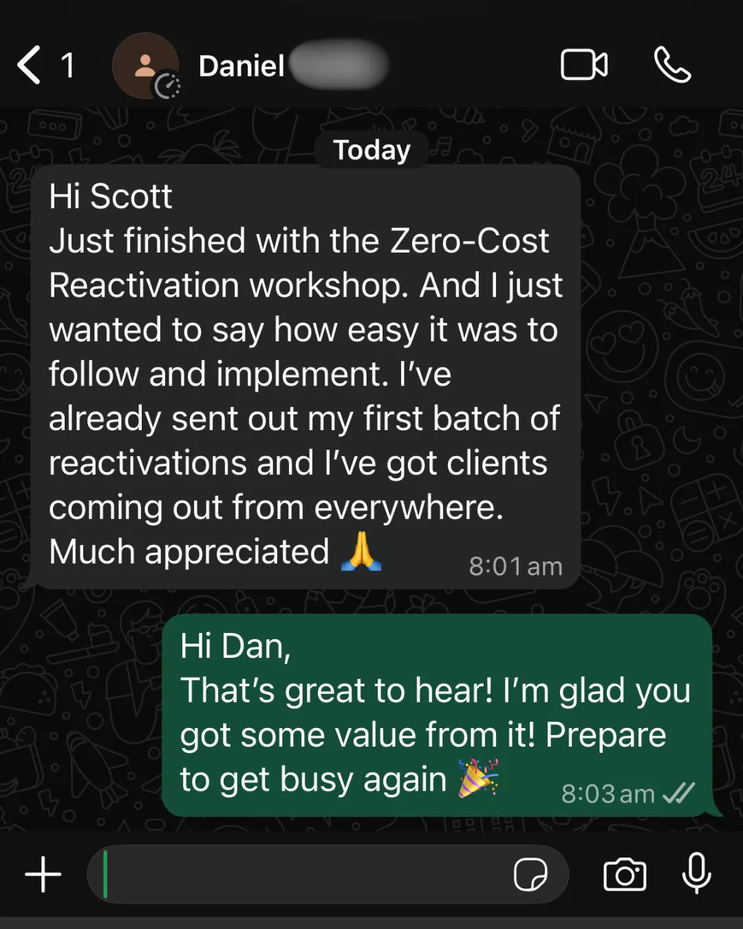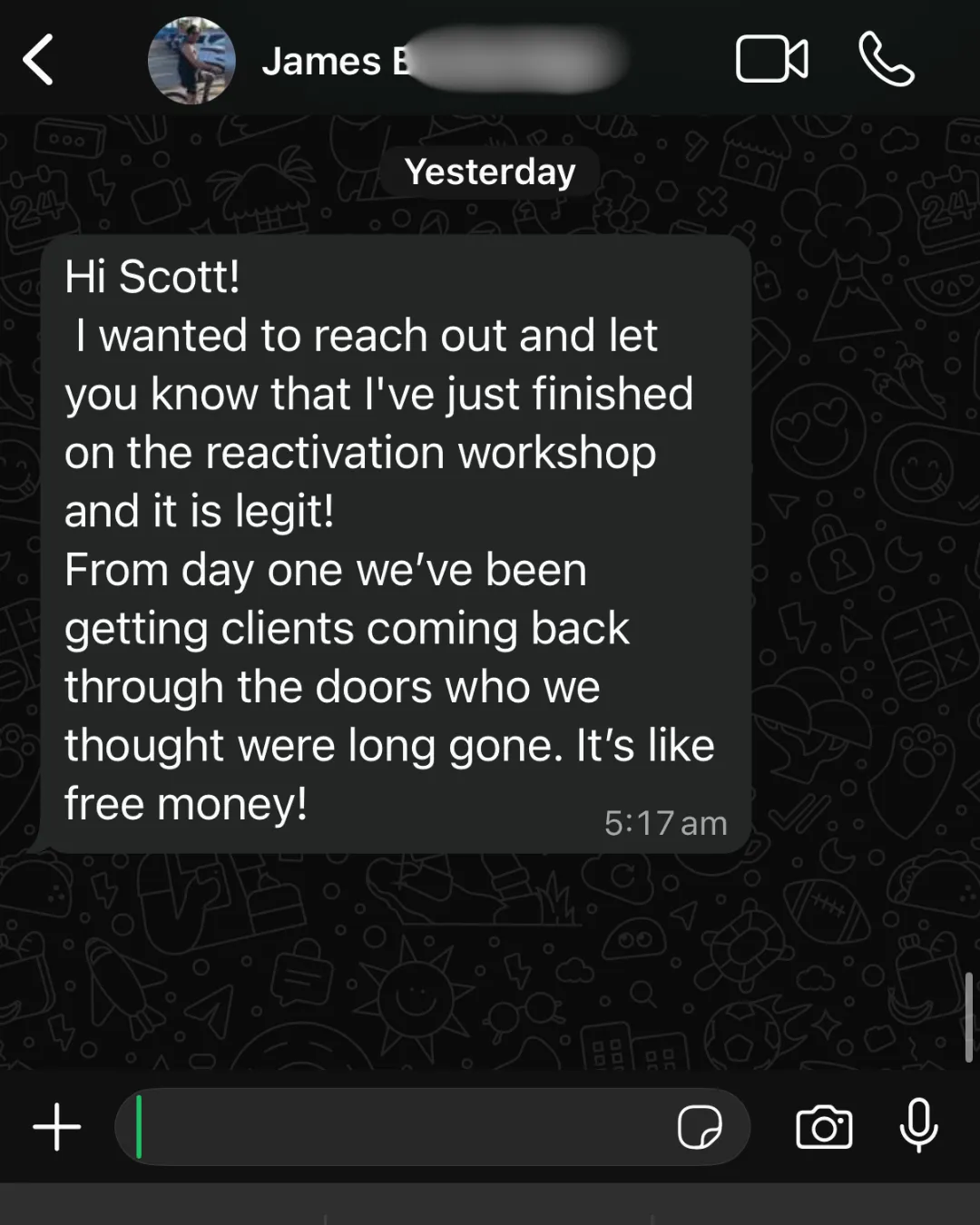 The Zero-Cost Reactivation Workshop is legit. From day one, we've been getting clients coming back through the doors who we thought were long gone. It's like free money.